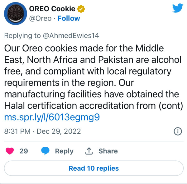 وكان الحساب الرسمي لبسكويت "أوريو" عبر موقع "تويتر" قد أكدّ سابقًا أن المنتج حلال بالفعل. وأوضحت الشركة في تغريدة أن "بسكويت أوريو الخاص بنا المصنوع للشّرق الأوسط، وشمال أفريقيا، وباكستان خالي من الكحول، ويتوافق مع المتطلّبات التنظيميّة المحليّة في المنطقة".