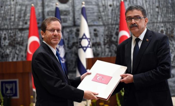 تسلم الرئيس الإسرائيلي يتساق هرتسوغ، مساء اليوم الأربعاء، أوراق اعتماد السفر التركي، شاكر أوزكان تورونلار، لأول مرة منذ عودة العلاقات الدبلوماسية بين الجانبين.