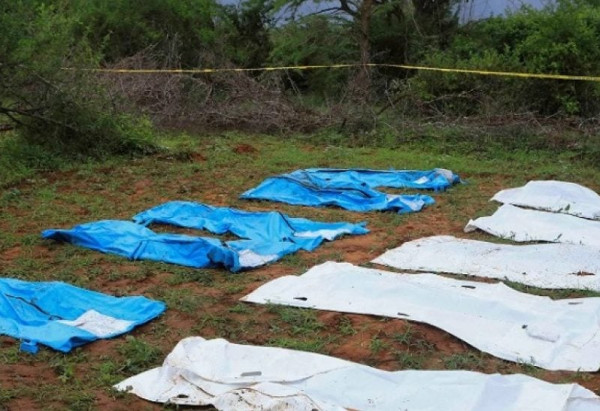 وقال وزير الداخلية، الكيني كيثوري كينديكي، إن عدد القتلى ارتفع بشكل مطرد في الأيام الأخيرة حيث أجرت السلطات الكينية عمليات استخراج جثث لمقابر جماعية عثر عليها في منطقة مساحتها 800 فدان من غابة شاكاهولا في شرق كينيا حيث كان مقر كنيسة غود نيوز الدولية.