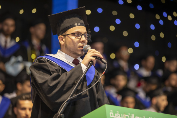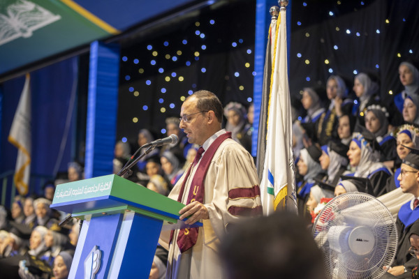 وخلال كلمته رحب الدكتور محمد العكلوك بالحضور، وقال: "نفتتحُ اليومَ في هذا المساءِ الجميلِ احتفالاتِنا بتخريجِ كوكبةٍ من طلابِ وطالباتِ عمادة تكنولوجيا المعلومات، التي أصبحتْ عصبًا أساسيًا وجزءًا مهمًا من حياتِنا تزدادُ حاجتُنا لهُ يومًا بعدَ يومٍ".
