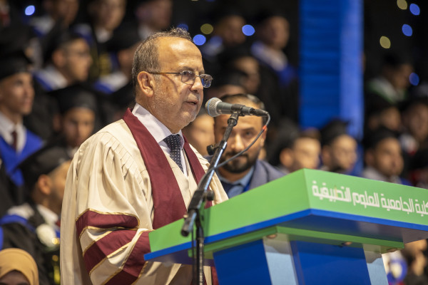 من جانبه رحب الدكتور سعيد الزبدة بالحضور، وقال: "نُرحبُ بِكمُ ونتشرفُ باستقبالِكُمْ فِي بيتِكم الثاني لنشاركَكُم فرحةَ النجاحِ بتخريجِ الفوجِ الرابعِ والعشرين من طلبتِنَا الرائعينَ، هذا الفوجُ الذي يحملُ اسماً مميزاً ألا وهو "فوجُ بناةُ الوطن"، والذي سيكونُ خريجوه قادرينَ على النهوضِ بوطنِنَا، وتجاوزِ العقباتِ التي نعايشُها فِي قِطَّاعِ غَزّةَ المحاصرِ، كيفَ لا، وهم أبناءُ هذه المؤسسةِ الرائدةِ التي تعتبرُ أحدَ أكبرِ المؤسساتِ الأكاديميةِ فِي مجالاتِ الْعُلُومِ التقنيةِ والتطبيقيةِ على مستوى الوطنِ".