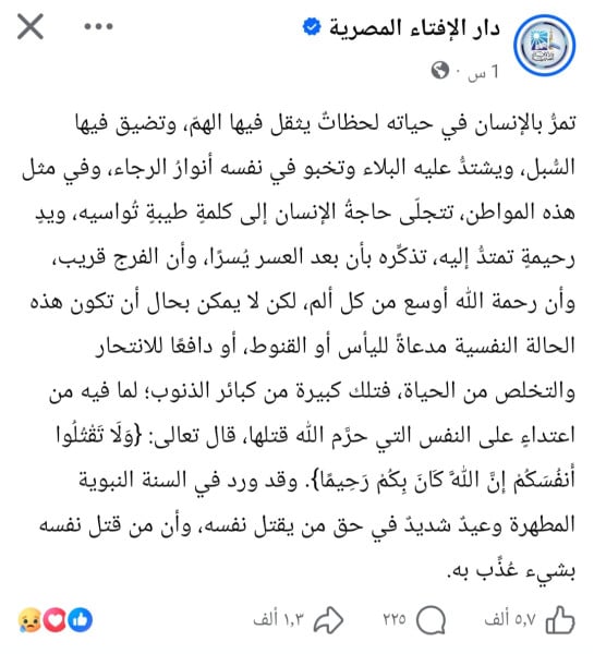 واختتمت دار الإفتاء بيانها بالإشارة إلى ما ورد في السنة النبوية المطهرة من وعيد شديد في حق من يقتل نفسه، مؤكدة أن من أقدم على هذا الفعل فقد عرض نفسه لغضب الله وعذابه، داعية الجميع إلى الصبر واللجوء إلى الله في أوقات الشدائد، وتعزيز قيم التكافل الاجتماعي لاحتواء من يمرون بأزمات نفسية قاسية.