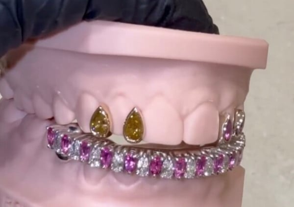 التصميم الجديد يحمل توقيع دار Gabby Elan Jewelry، التي قدّمت قطعة استثنائية تجمع بين الجرأة والدقة. الصف العلوي من الأسنان جاء مرصعاً بماسات بيضاء بقصة كمثرية، بينما يزدان الصف السفلي بياقوت وردي لافت ممزوج بألماس فاخر، ما يمنح الابتسامة بريقاً غير مسبوق.
