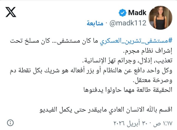 وتداول مغردون تعليقات غاضبة، واصفين سوريا بـ"السجن الكبير سابقا"، مشيرين إلى ما وصفوه بتعذيب المصابين داخل مشفى تشرين العسكري، الذي قالوا إنه "لا يقل دموية عن سجن صيدنايا"، على حد تعبيرهم.