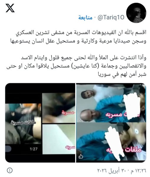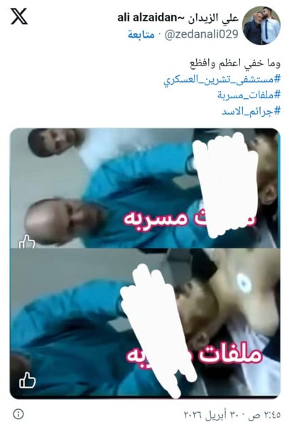 وقال صاحب الحساب إن الفيديوهات، التي تُنشر للمرة الأولى، صُوّرت من داخل أروقة مشاف عسكرية، وتُظهر بحسب زعمه أطباء وعناصر من المخابرات العسكرية أثناء انتزاع أعضاء من معتقلين، مضيفا أن هذه المواد توثق أيضا جثثا لمعتقلين قبل نقلها إلى المقابر الجماعية.