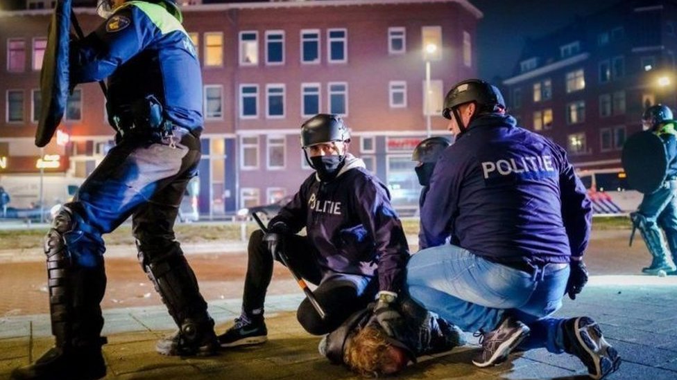ففي العاصمة الهولندية أمسترادم، استخدمت الشرطة خراطيم المياه لإخلاء المتظاهرين من ميدان المتحف، وهو مكان يشهد مظاهرات متكررة غير مصرح بها. وأظهرت لقطات على الإنترنت شرطيا ومعه يدفع إمراة في صدرها ويعتدي بهراوة على رجل حاول حمايتها.