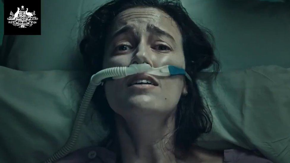 ففي الإعلان الحكومي، تظهر امراة على سرير في المستشفى تتنفس بصعوبة رغم اتصالها بجهاز للتنفس.
