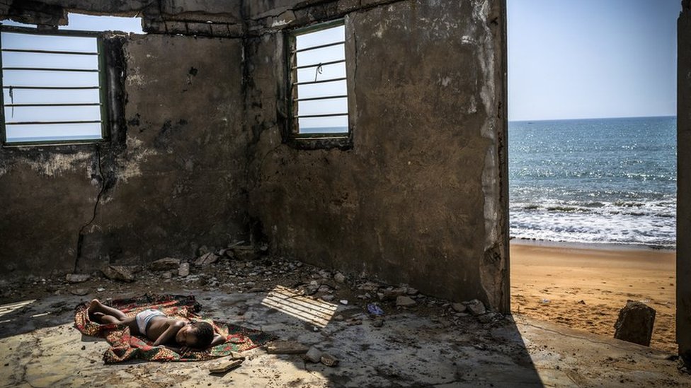 فاز المصور الإسباني، أنطونيو أراغون رينونسيو، بجائزة مصور البيئة لعام 2021 عن صورته لطفل نائم داخل منزل خرب بفعل تآكل السواحل على شاطئ أفيادينيجبا في غانا.